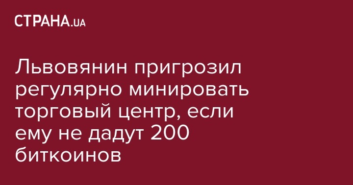 Во вторник, 27 декабря, неизвестные сообщили о "минировании" торгового центра "Роксолана" во Львове и потребовали 200 биткоинов, чтобы эти сообщения не стали ежедневными. Об этом сообщает пресс-служба торгового центра.