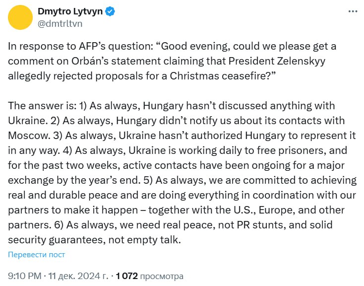 "В ответ на вопрос AFP: "Добрый вечер, не могли бы вы прокомментировать заявление Орбана о том, что президент Зеленский якобы отклонил предложения о рождественском прекращении огня?" Ответ: 1) Как всегда, Венгрия ничего не обсуждала с Украиной", – написал советник президента. 2) Как всегда, Венгрия не уведомила нас о своих контактах с Москвой. 3) Как всегда, Украина не уполномочила Венгрию представлять ее каким-либо образом. 4) Как всегда, Украина ежедневно работает над освобождением заключенных, и в течение последних двух недель продолжаются активные контакты для проведения крупного обмена до конца года. 5) Как всегда, мы стремимся к достижению реального и прочного мира и делаем все возможное для этого в координации с нашими партнерами – вместе с США, Европой и другими партнерами. 6) Как всегда, нам нужен настоящий мир, а не пиар-трюки, и надежные гарантии безопасности, а не пустые разговоры", – добавил он.