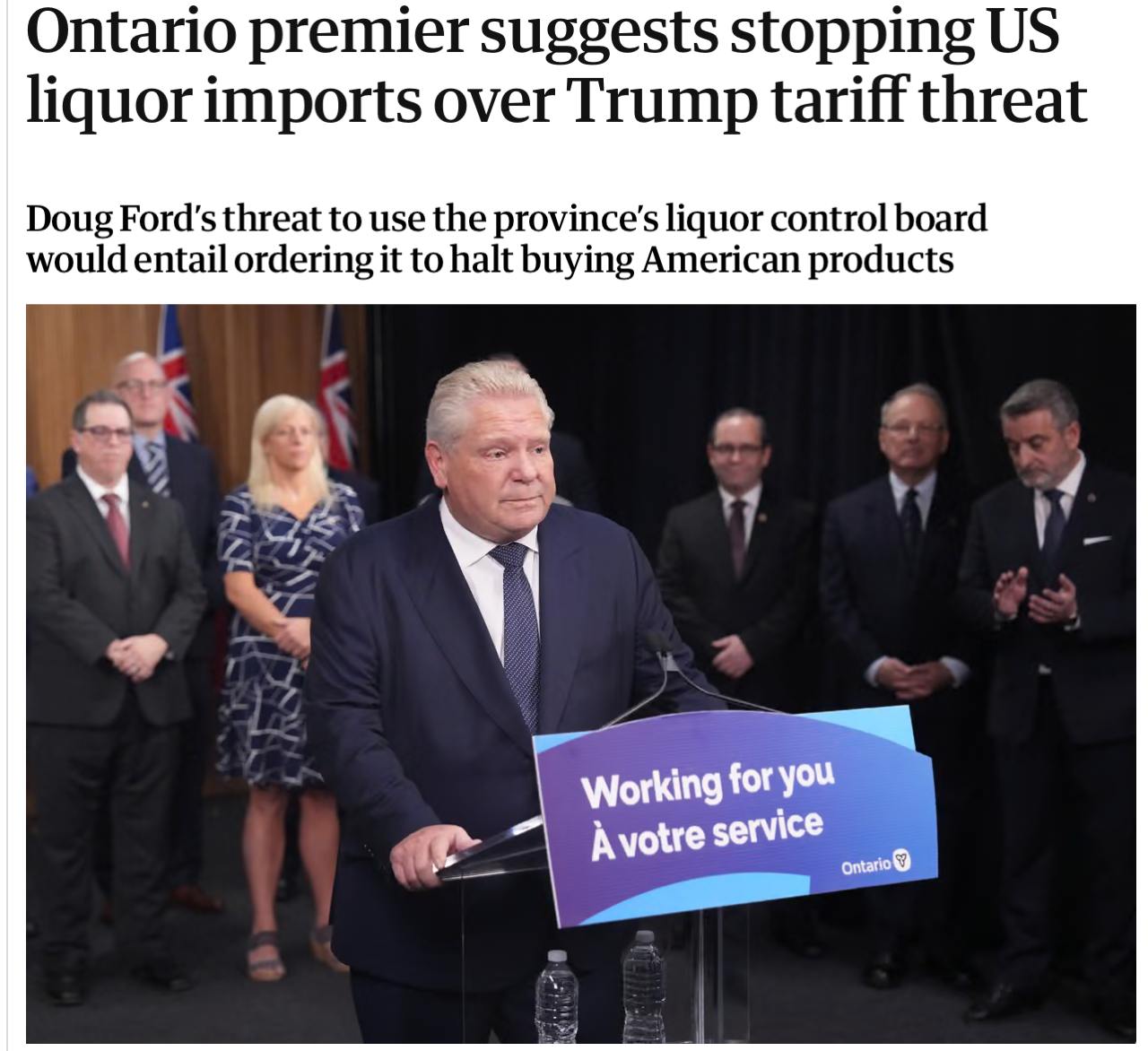 Еще одна мера - The Guardian пишет, что власти провинции Онтарио могут ввести ограничения на импорт алкоголя из США - в частности, виски и бурбона. Также раньше в Онтарио угрожали остановить поставки электроэнергии в Штаты.
