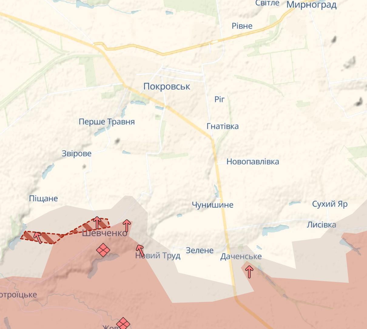 11.36 Россияне снова продвинулись под Покровском, где накануне контратаковали ВСУ, свидетельствует карта Deep State.