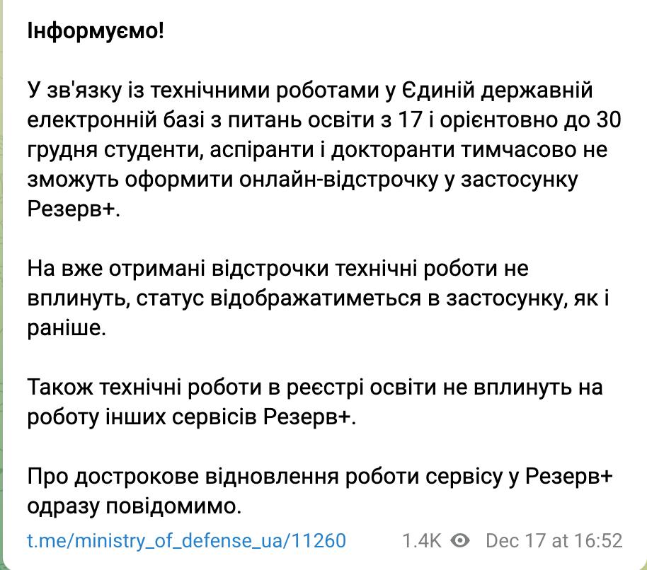 Причина - "технические работы в Единой государственной электронной базе по вопросам образования". Уже полученные отсрочки продолжат действовать.