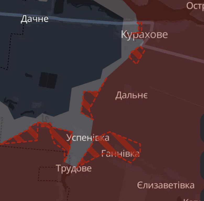 Западнее россияне, как видно по карте Deep State, ещё ближе подошли к трассе на Курахово с запада. Они уже менее, чем в двух километрах от ключевого села Константинополь.