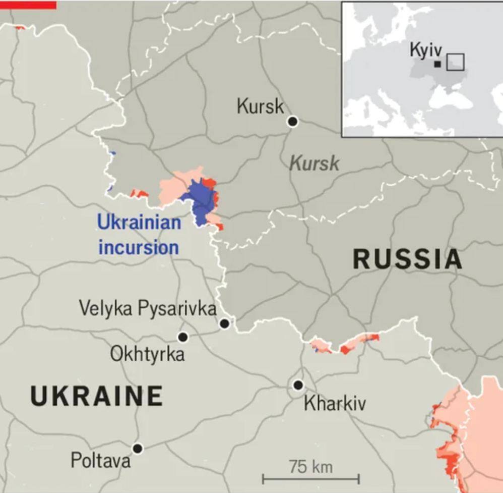 Издание также публикует карту украинского присутствия в Курской области. По ней видно, какую территорию смогла отбить назад Россия (красный и розовый цвета).