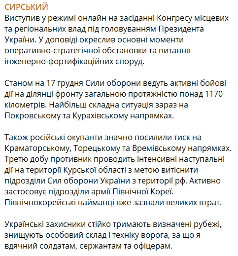 При этом наиболее сложная ситуация сейчас на Покровском и Кураховском направлениях, добавил Сырский.