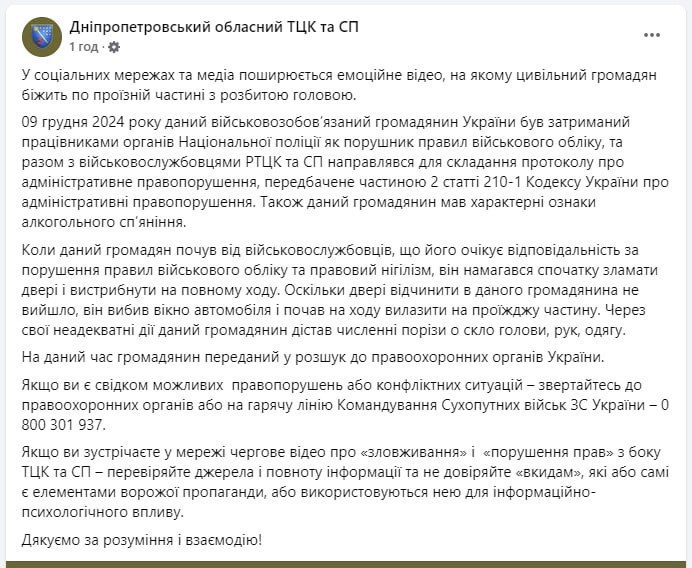 По информации ТЦК, "задержанный, нарушивший правила военного учета, был в состоянии алкогольного опьянения и пытался скрыться во время транспортировки".