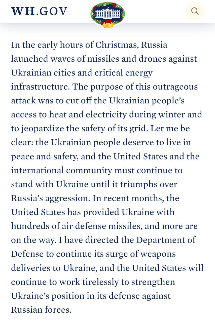 "Целью этой возмутительной атаки было лишить украинский народ доступа к теплу и электричеству в зимний период и поставить под угрозу безопасность электросетей", - говорится в заявлении Байдена.