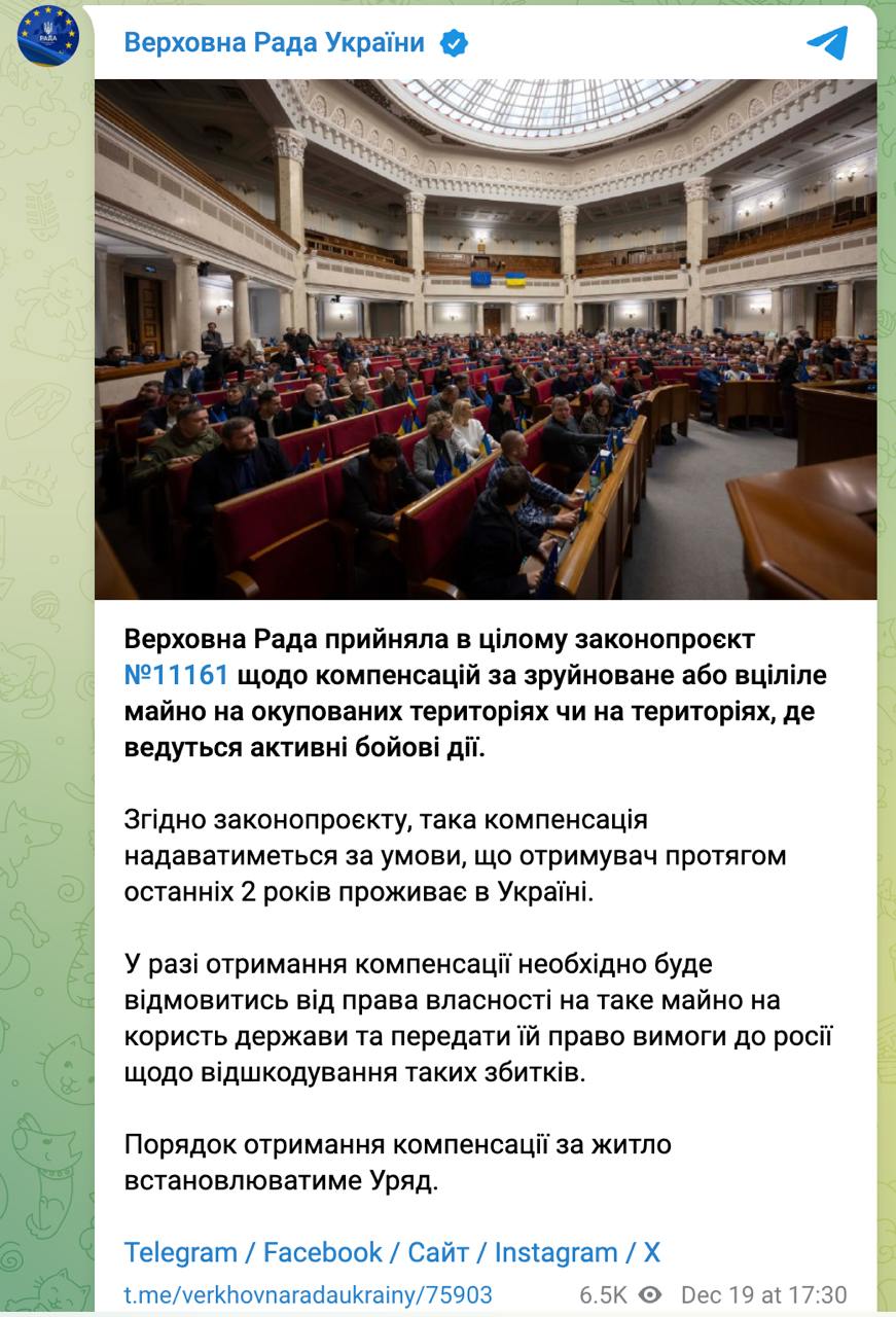 Сегодня, 20 декабря, Верховная Рада приняла в целом законопроект о компенсациях, по которому получить их смогут те, кто в течение последних двух лет проживает в Украине.