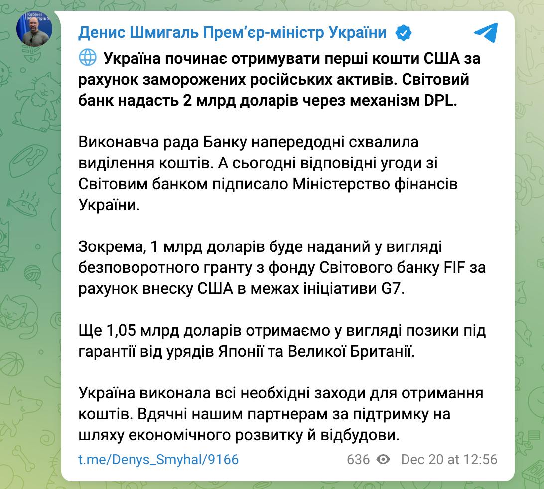 Один миллиард Украина получит в виде безвозвратного гранта из фонда Всемирного банка FIF за счет вклада США в рамках инициативы G7. Еще 1,05 млрд долларов - в виде ссуды под гарантии от правительств Японии и Великобритании.