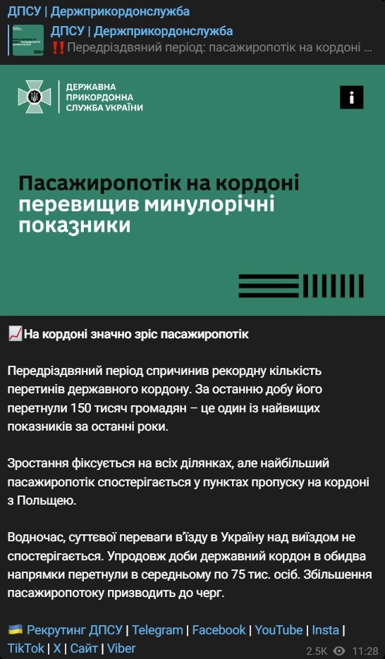 13:35 150 000 украинцев пересекли границу за минувшие сутки, сообщает Госпогранслужба. Это рекордный пассажиропоток за последние годы.