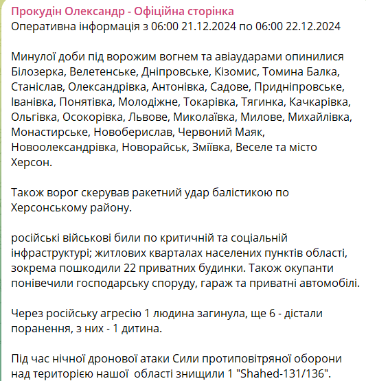 08:00 В течении прошлых суток в Херсонской области из-за российской агрессии 1 человек погиб, еще 6 - получили ранения, из них - 1 ребенок.