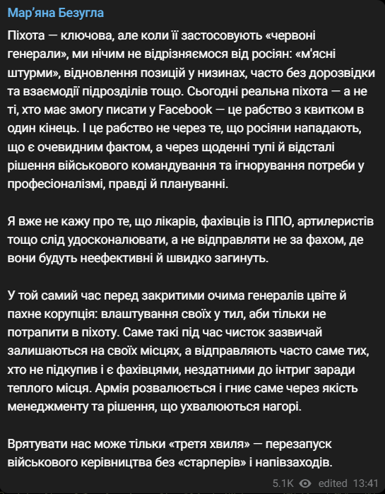 "Мы ничем не отличаемся от россиян: мясные штурмы, восстановление позиций в низинах, часто без доразведки и взаимодействия подразделений и т.д. Сегодня реальная пехота - а не те, кто может писать в Facebook - это рабство с билетом в один конец. И это рабство не из-за того, что россияне нападают, что является очевидным фактом, а из-за ежедневных тупых и отсталых решений военного командования и игнорирования потребности в профессионализме, правде и планировании", - пишет Безуглая.