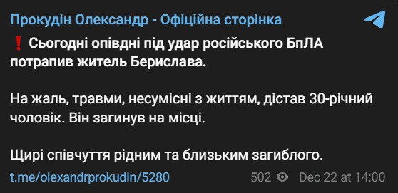 14:02 В результате удара российского БпЛА погиб житель Берислава, сообщает глава Херсонской ОВА Александр Прокудин.