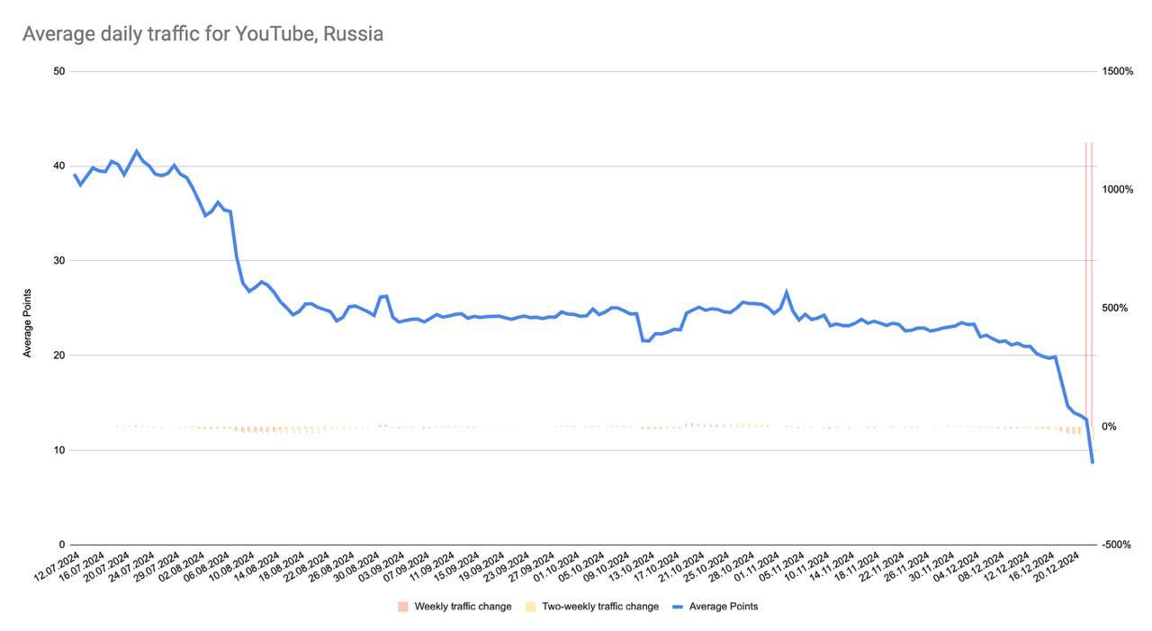 В России фактически заблокирован популярный видеохостинг YouTube. Зайти на платформу не могут 80% населения страны, просмотры составляют около 20% от нормального значения.