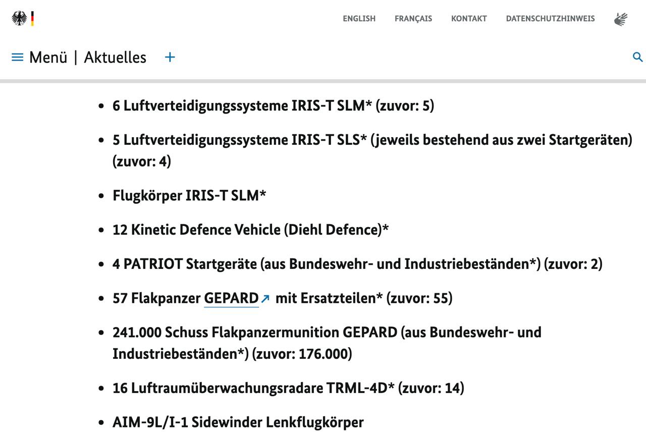 Правительство Германии объявило о передаче Украине нового пакета военной помощи, в который вошли две системы ПВО IRIS-T (среднего и ближнего радиуса) и две пусковые установки Patriot.