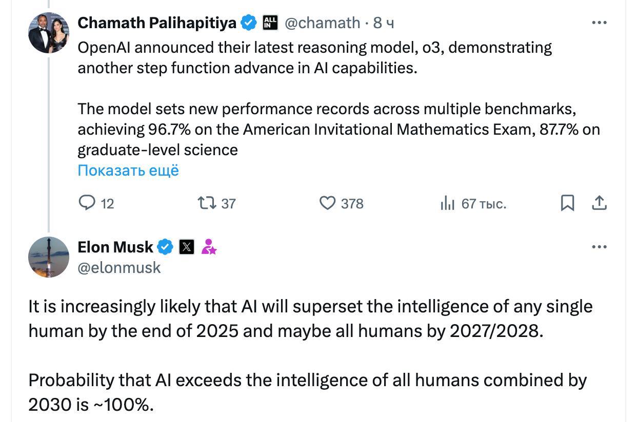 Так он прокомментировал пост венчурного инвестора Чамата Палихапития о возможностях новой анонсированной модели ChatGPT о3 компании OpenAI.
