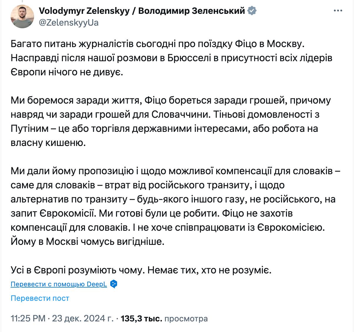 "Мы дали ему предложение и относительно возможной компенсации для словаков – именно для словаков – потерь от российского транзита, и альтернатив по транзиту – любого другого газа, не российского, по запросу Еврокомиссии. Мы готовы были это делать. Фицо не захотел компенсации для словаков. И не хочет сотрудничать с Еврокомиссией. Ему в Москве почему-то выгоднее", - пишет президент в Х.