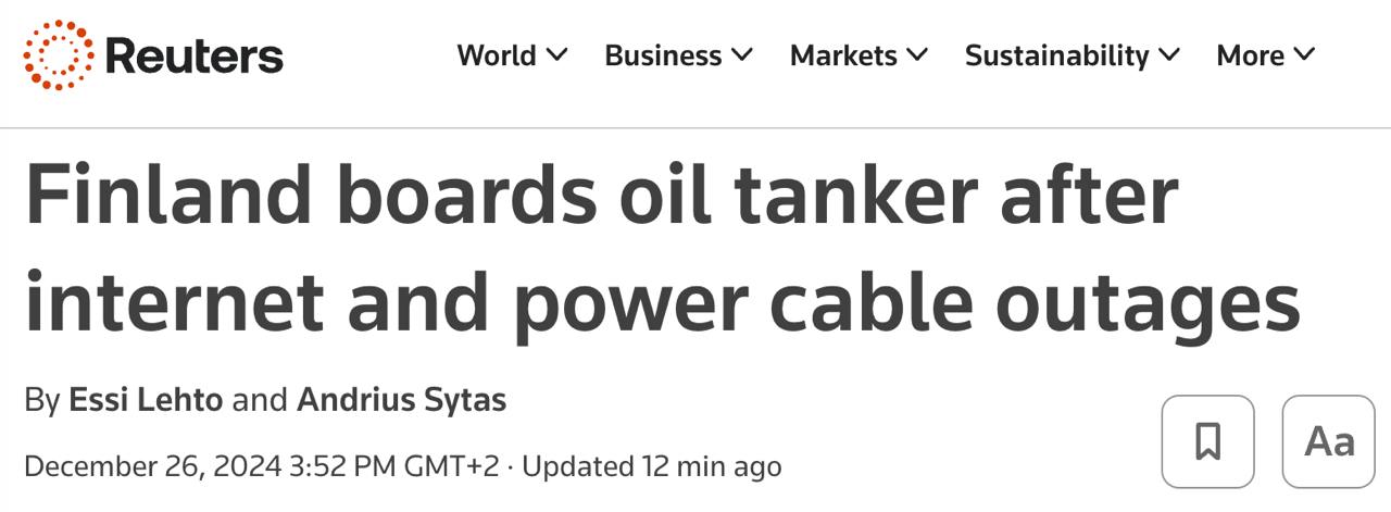 Финляндия задержала нефтяной танкер Eagle S под флагом Островов Кука, следовавший из России, по подозрению в повреждении сразу четырех кабелей в Балтийском море: одного - электропитания и трех - интернет-линий, соединяющих Финляндию и Эстонию.