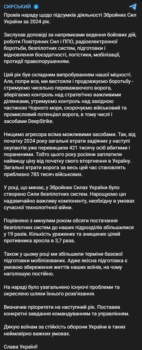 Об этом заявил главнокомандующий ВСУ Александр Сырский после совещания по итогам деятельности Вооруженных сил Украины за 2024 год.