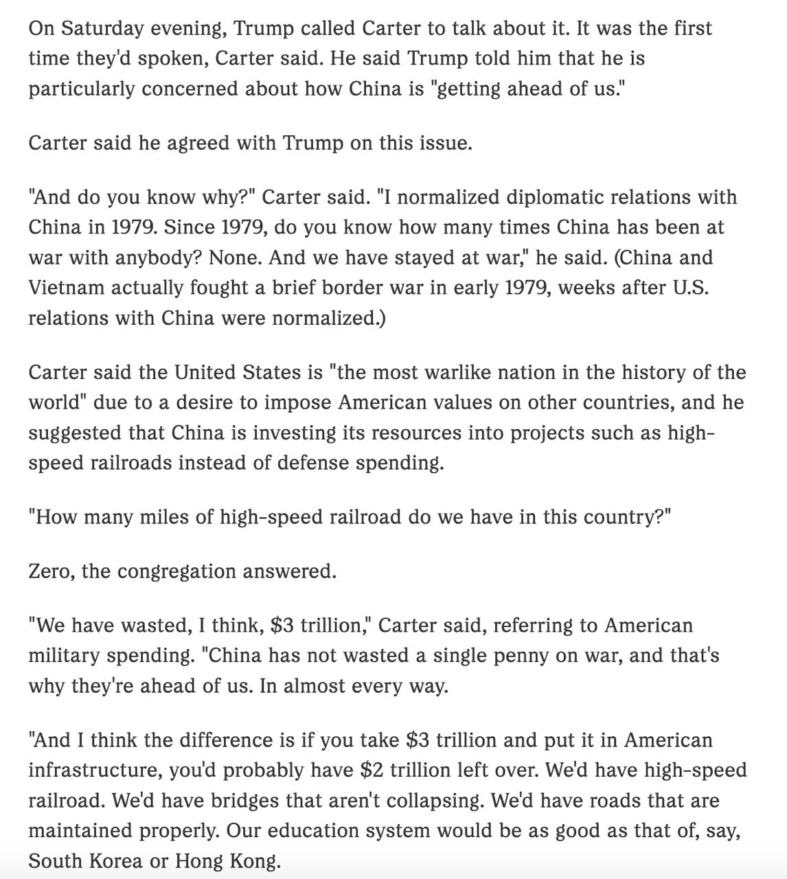 Картер также сказал, что Соединенные Штаты являются "самой воинственной страной в истории мира" из-за желания навязать американские ценности другим странам, и предположил, что Китай вкладывает свои ресурсы в такие проекты, как высокоскоростные железные дороги, а не в расходы на оборону.
