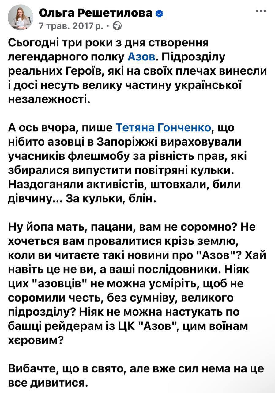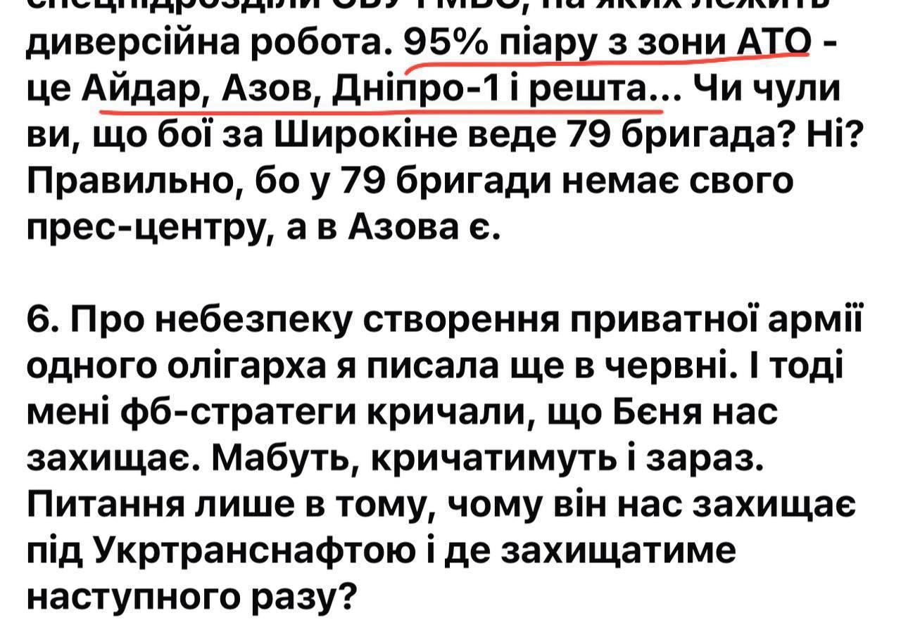 "95% пиара из зоны АТО - Айдар, Азов, Днепр-1. Вы слышали, что бои за Широкино (село около Мариуполя, участие в боях за которое "Азова" в 2015 году широко освещалось в СМИ - Ред.) ведет 79-я бригада. Нет? Правильно. Потому что у 79-й бригады нет своего пресс-центра, а у "Азова" есть", - писала Решетилова.