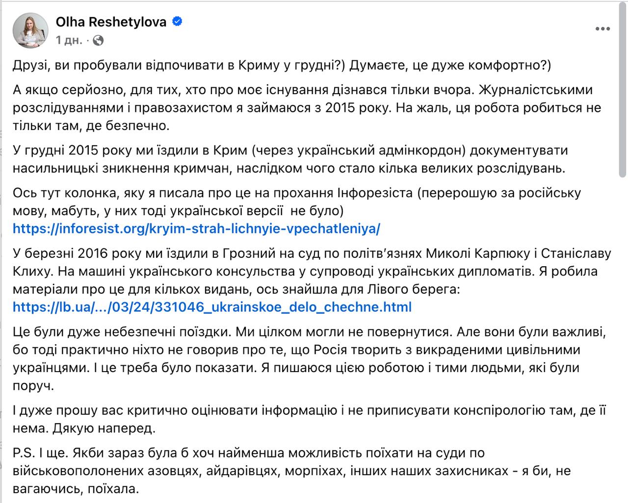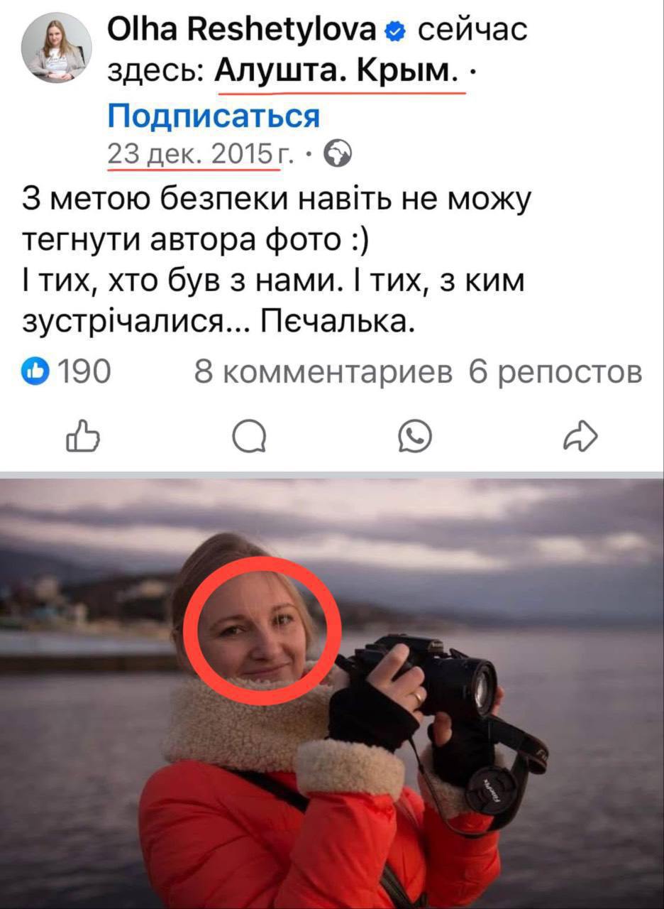 Ряд украинских блогеров и военных публикуют фото и скриншоты, согласно которым Решетилова фотографировалась на проспекте Путина в Грозном, ездила в Крым после аннексии, критиковала ультраправых из "Азова" и других добробатов.