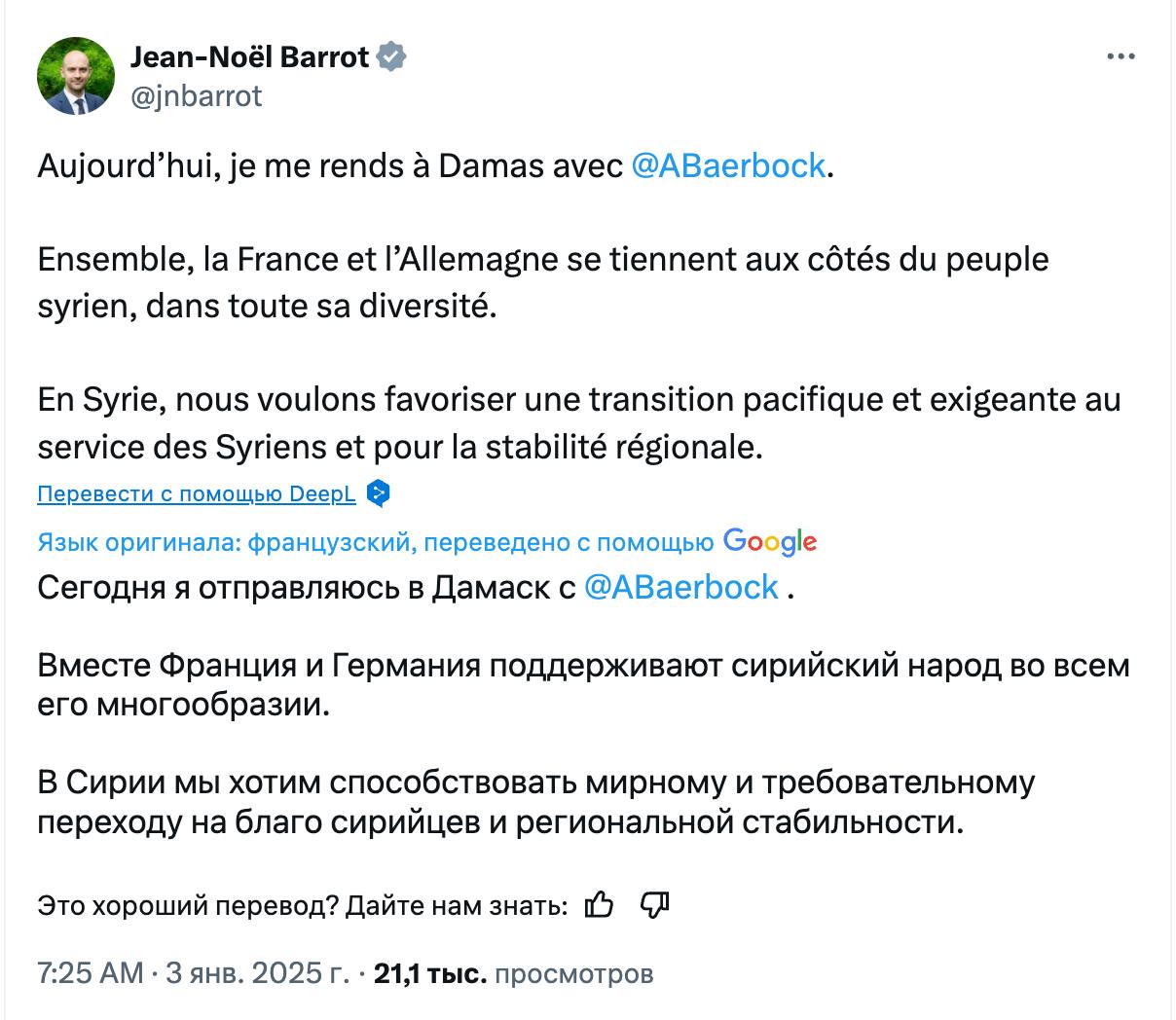 "В Сирии мы хотим помочь осуществить мирный переход власти, который бы пошел на пользу сирийцам и региональной стабильности", - написал Барро в Х.