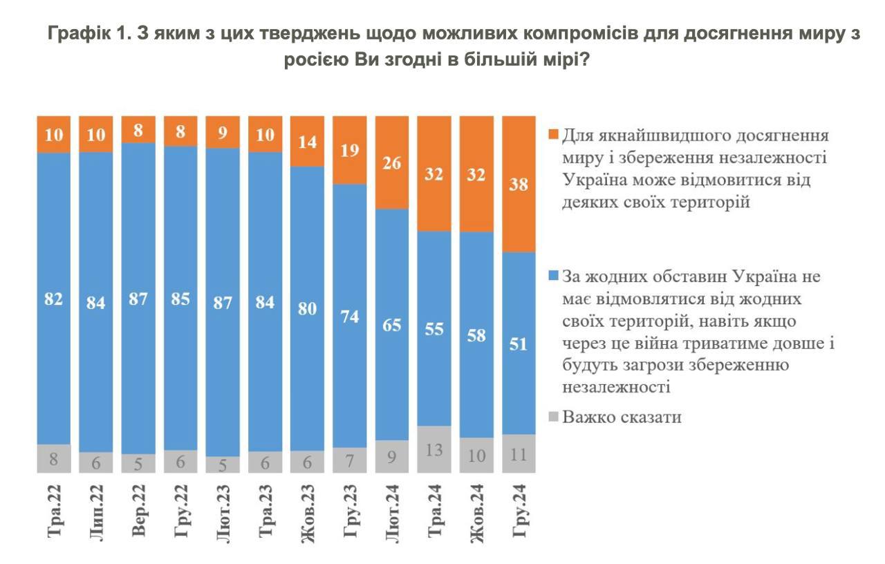 За минувший год вдвое увеличилось количество украинцев, готовых к отказу от части территорий ради мира и сохранения независимости, свидетельствует опрос КМИС. В декабре 2023 года таких было 19%, а в декабре 2024 - уже 38%. Больше всего к этому готовы жители юга (40%) и востока (41%), где идут боевые действия. На западе - 35%, в центре - 38%.
