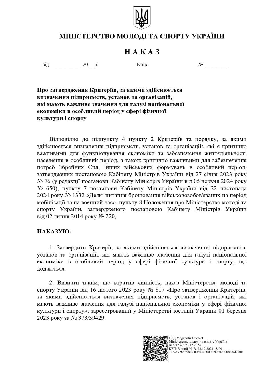 Министерство молодежи и спорта утвердило новые критерии, согласно которым осуществляется определение предприятий, учреждений и организаций, имеющих важное значение для отрасли национальной экономики в особый период в сфере физической культуры и спорта.