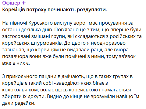 "На севере Курского выступа враг имеет продвижение за последние несколько дней. Связано это с тем, что впервые были применены смешанные группы, состоящие из российских и корейских штурмовиков", – написал военный.
