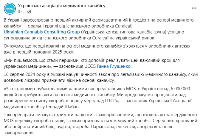"Мы гордимся, что стали первыми, кто помог реализовать этот важный шаг для украинской медицины", - заявила основательница Ukrainian Cannabis Consulting Group Анна Глущенко.