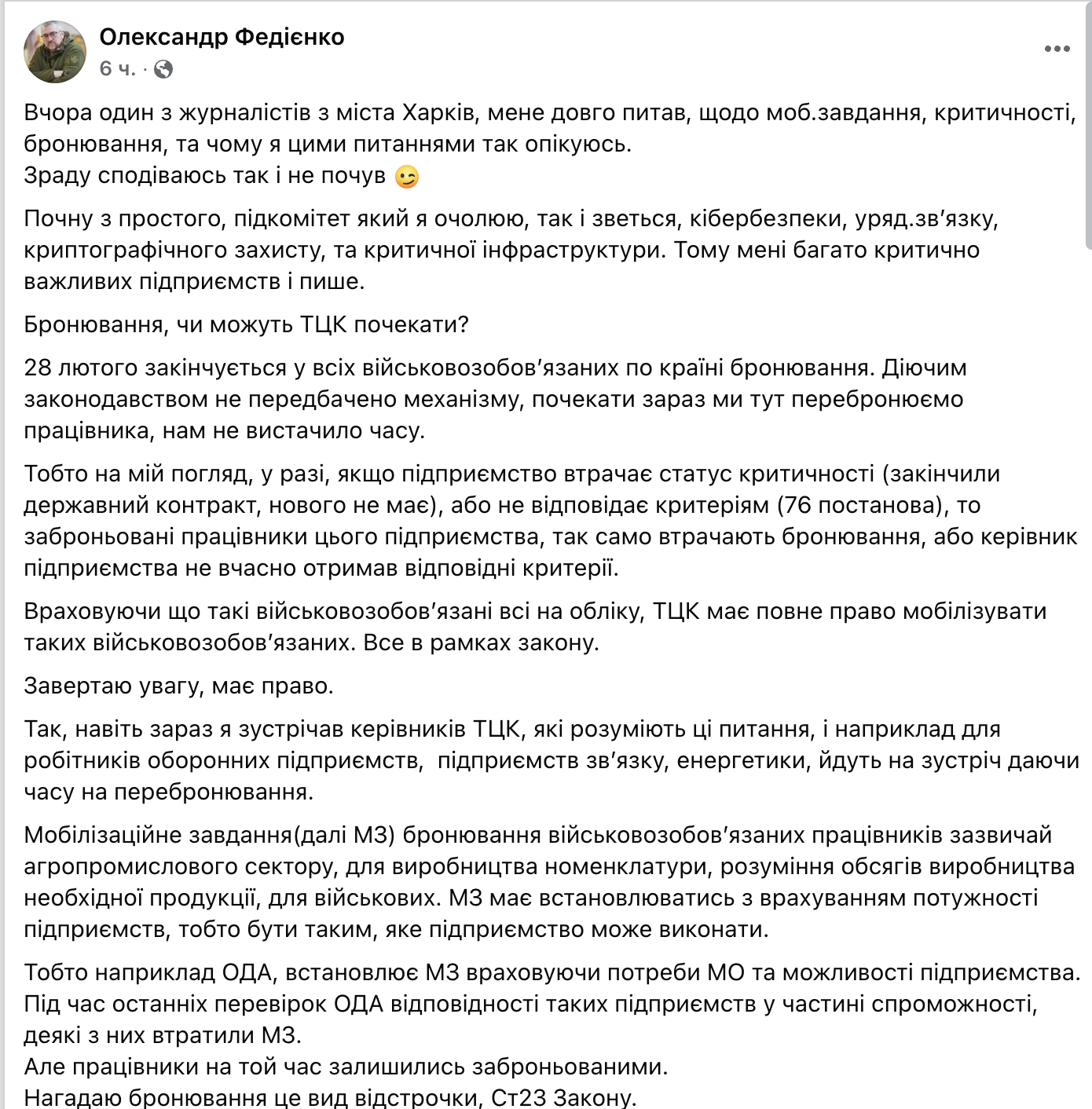 "28 февраля заканчивается у всех военнообязанных по стране бронирование. Если предприятие теряет статус критичности (закончился государственный контракт, нового нет), или не отвечает критериям, то забронированные работники этого предприятия также теряют бронирование, или руководитель предприятия не вовремя получил соответствующие критерии. Учитывая, что такие военнообязанные все на учете, ТЦК имеет полное право мобилизовать таких военнообязанных", - пишет член оборонного комитета.