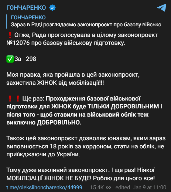 Также народный депутат Алексей Гончаренко сообщил, что в законопроект внесли правку, которая отменяет "первый шаг" к мобилизации женщин.