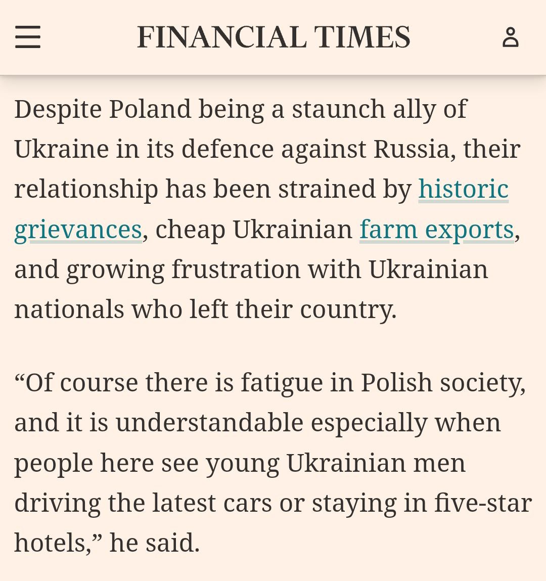 "Конечно, в польском обществе есть усталость, и это понятно, особенно когда люди здесь видят молодых украинских мужчин за рулем новейших автомобилей или проживающих в пятизвездочных отелях", - сказал он.
