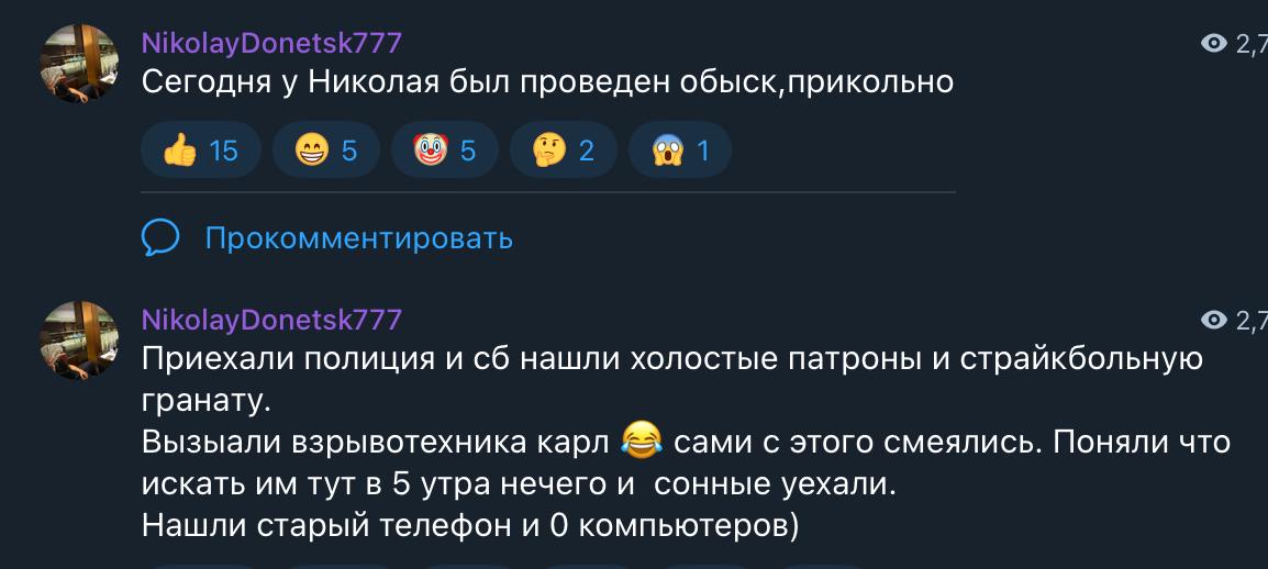 Он заявил в своем телеграм-канале, что у него нашли холостые патроны и страйкбольную гранату.