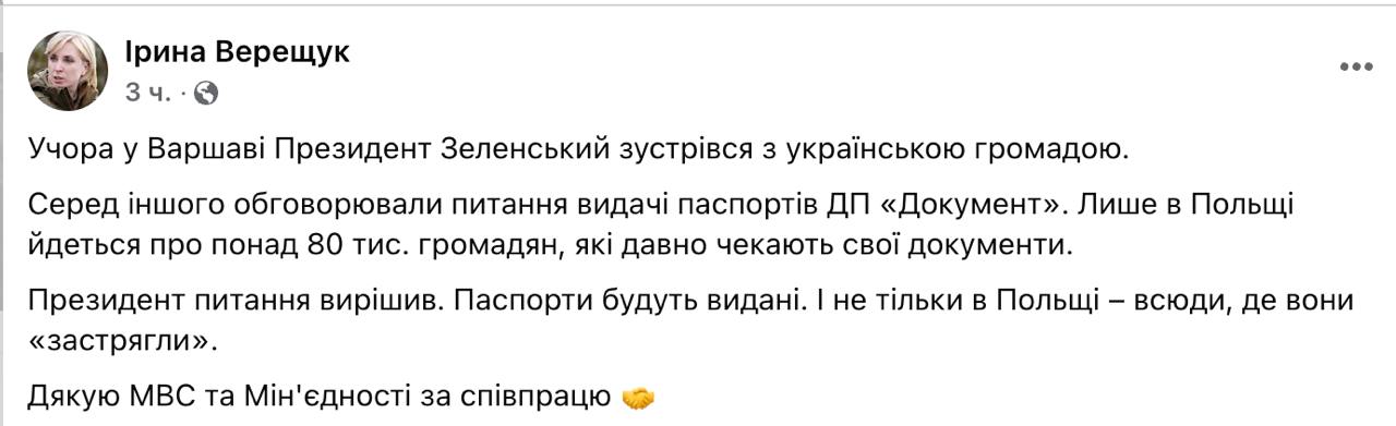 "Президент вопрос решил. Паспорта будут выданы. И не только в Польше - везде, где они застряли", - написала Верещук.