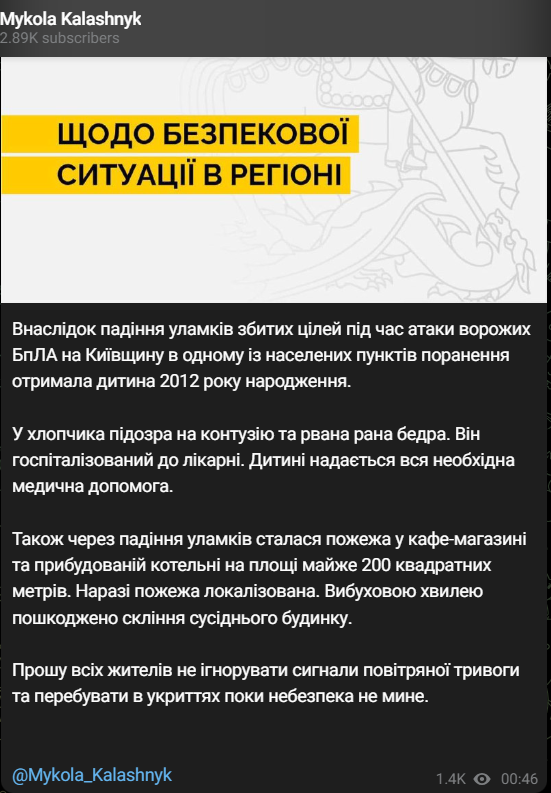 08:05 В Киевской области в результате падения обломков сбитых вражеских БПЛА в одном из населенных пунктов ранения получил ребенок 2012 года рождения.