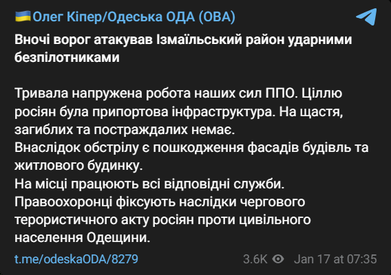 "Продолжилась напряженная работа наших сил ПВО. Целью россиян была припортовая инфраструктура. К счастью, погибших и пострадавших нет", - написал он.