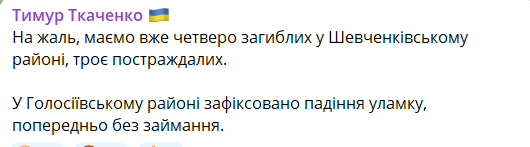 "К сожалению, уже четверо погибших в Шевченковском районе, трое пострадавших", - написал главы КГВА Тимур Ткаченко.