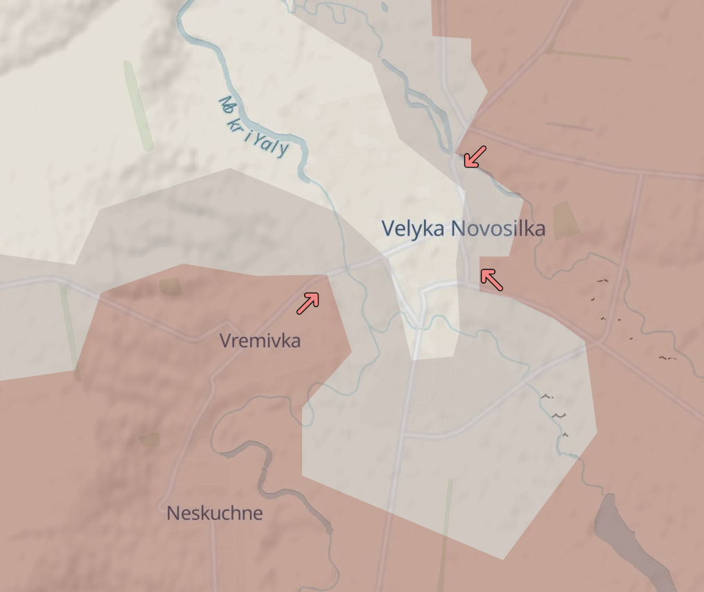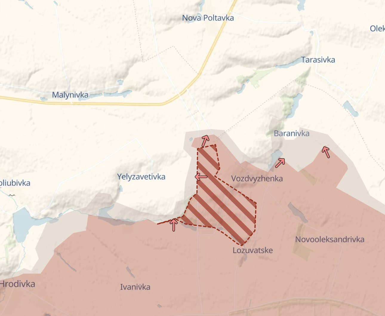 Карта Deep State фиксирует за сутки два российских продвижения - в районе Воздвиженки к востоку от Покровска и северо-западнее Курахово (к северу от Славянки).