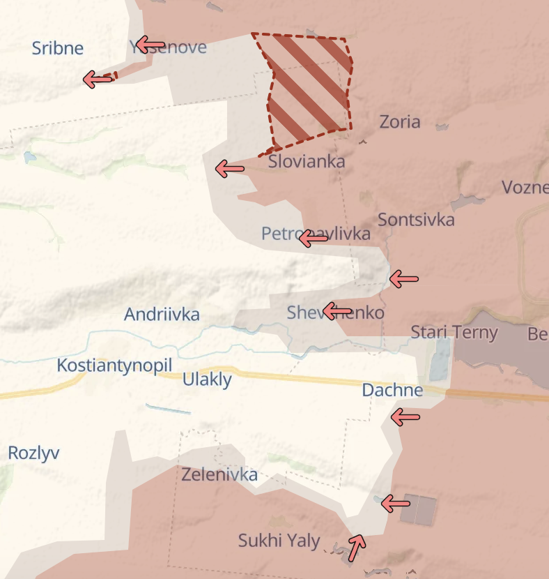 Под Покровском идут контратаки ВСУ в районе Удачного, но бои, по данным "Мучного", очень интенсивные. Также россияне уже совершают FPV-атаки на трассу Покровск - Павлоград, по которой стало опасно ездить.