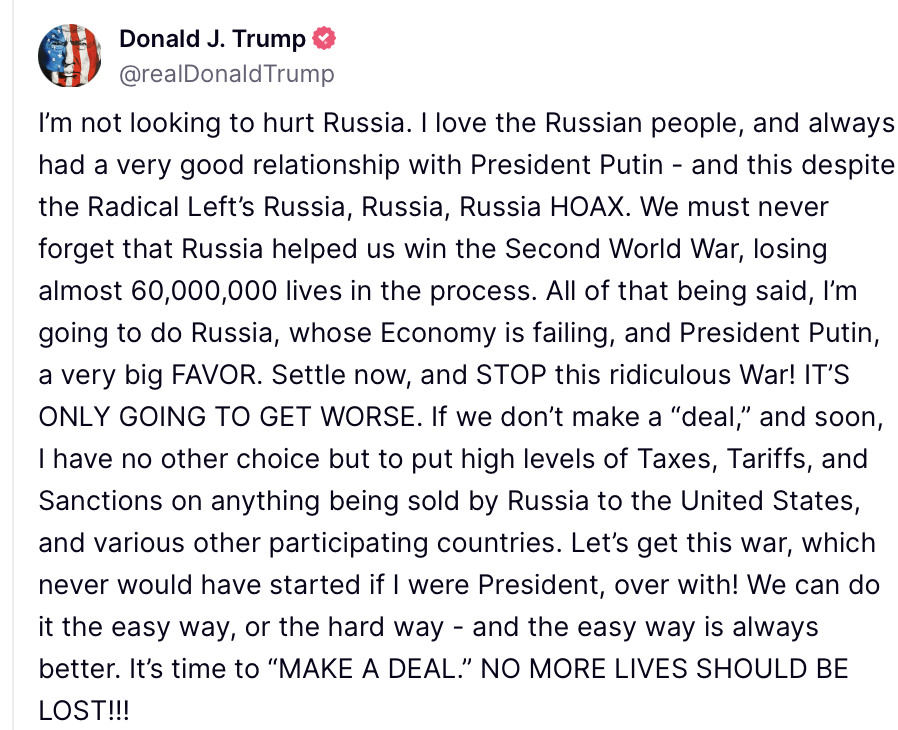 "Я собираюсь сделать для России, чья экономика терпит крах, и для президента Путина очень большое одолжение. Давайте заключим соглашение сейчас и остановим эту нелепую войну! Дальше будет только хуже. Если мы не достигнем "сделки" в ближайшее время, у меня не останется другого выбора, кроме как ввести высокие налоги, тарифы и санкции на все, что Россия продает в Соединенные Штаты и другие страны, которые участвуют в этом процессе", - написал Трамп у себя в соцсети.