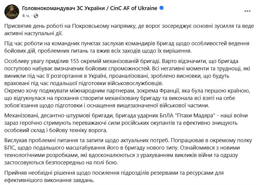 "Приняли необходимые решения для укрепления резервов и ресурсных подразделений для более эффективного выполнения задач", - написал Сырский.