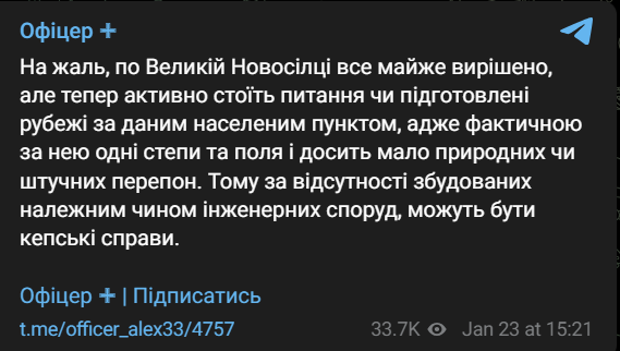Лейтенант ВСУ Алекс пишет, что "по Великой Новоселке все почти решено", и теперь вопрос в количестве фортификаций севернее, ведь "за ней одни степи и поля и мало естественных или искусственных преград", и без построенных должным образом инженерных сооружений "могут быть плохие дела".