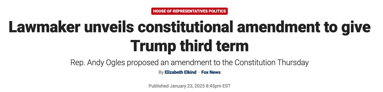 Сторонник Дональда Трампа в Палате представителей Энди Оглз представил поправку к конституции, которая позволит президенту США баллотироваться на третий срок.
