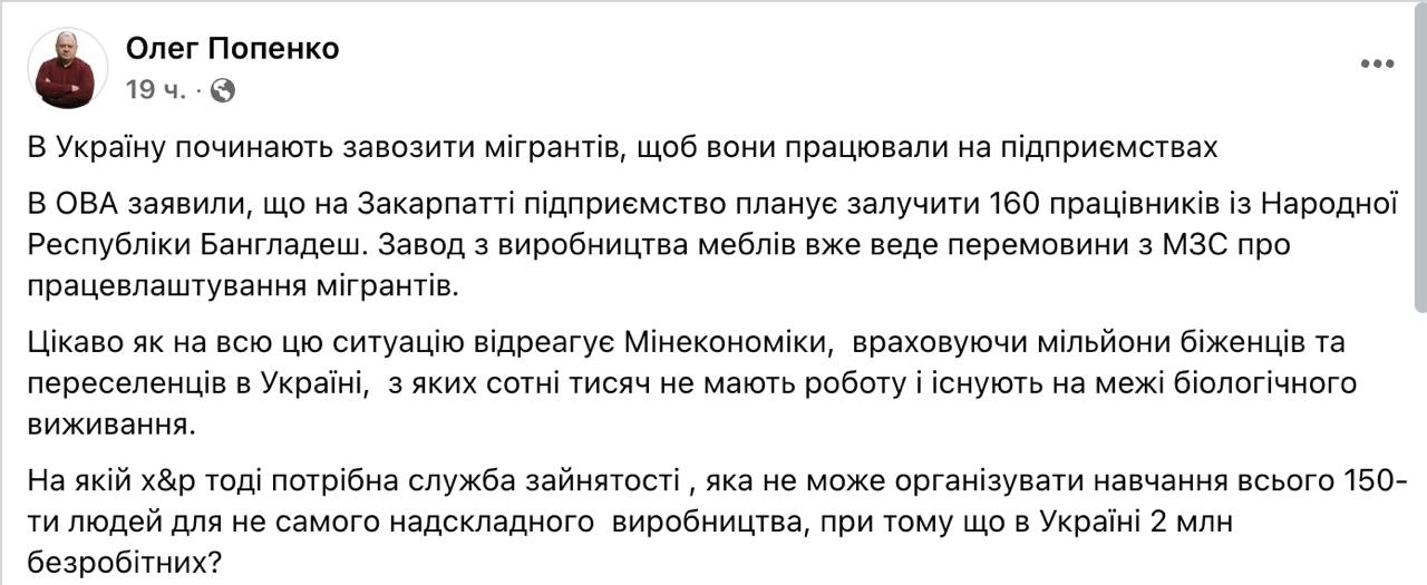 "Не знаю ситуацию именно по этому предприятию и не готов без изучения вопроса говорить, почему именно в этом случае бизнес решил привлечь мигрантов. Но в целом ситуация выглядит так: безработица стремительно сокращается и меняется на кадровый кризис, потому что миллионы людей на фронте или за рубежом. Проблема с привлечением кадров есть уже сейчас, и будет расти... Поэтому трудовая миграция будет, мы от этого никуда не денемся", - написал глава департамента коммуникаций Государственной службы занятости Андрей Яницкий.