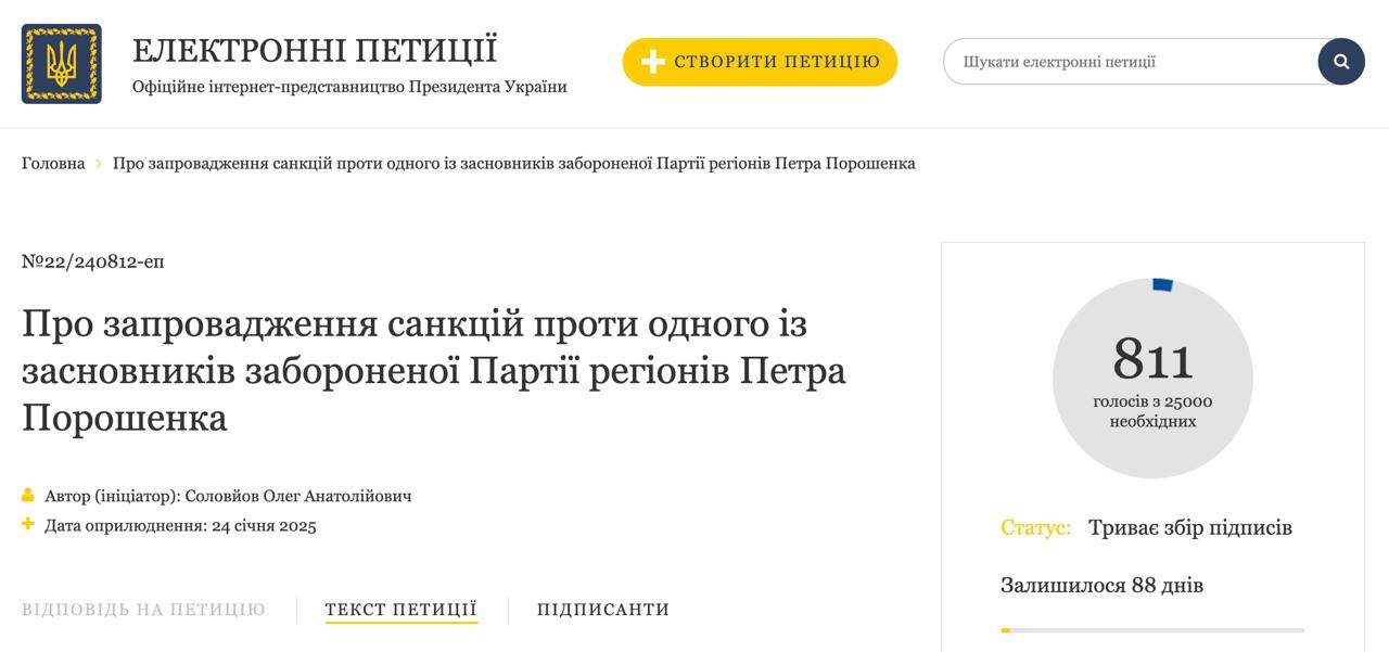 "Прошу рассмотреть предложение о введении санкций против одного из учредителей запрещенной "Партии регионов" Петра Порошенко из-за его деятельности, которая нанесла существенный ущерб национальным интересам Украины", - пишет автор петиции.