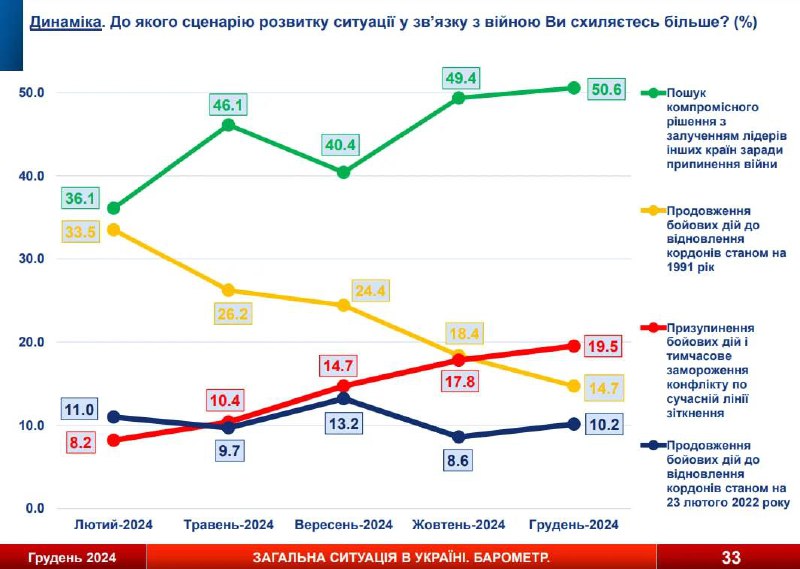 В декабре прошлого года 50,6% опрошенных заявили, что выступают за "поиск компромиссного решения с привлечением лидеров других стран для прекращения войны". В октябре 2024-го таких респондентов было 49,4%, в сентябре - 40,4%, а в феврале - 36,1%.