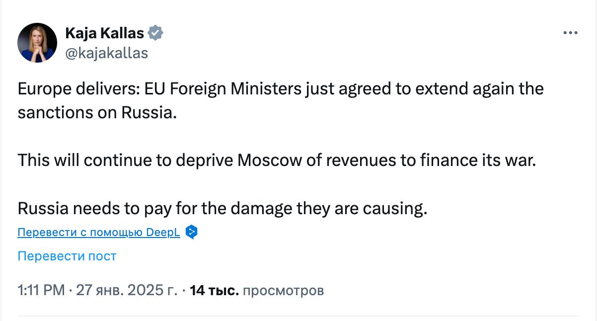 "Европа справляется: министры иностранных дел ЕС только что согласились снова продлить санкции против России. Это продолжит лишать Москву доходов для финансирования ее войны. Россия должна заплатить за ущерб, который она наносит", - написала чиновница.