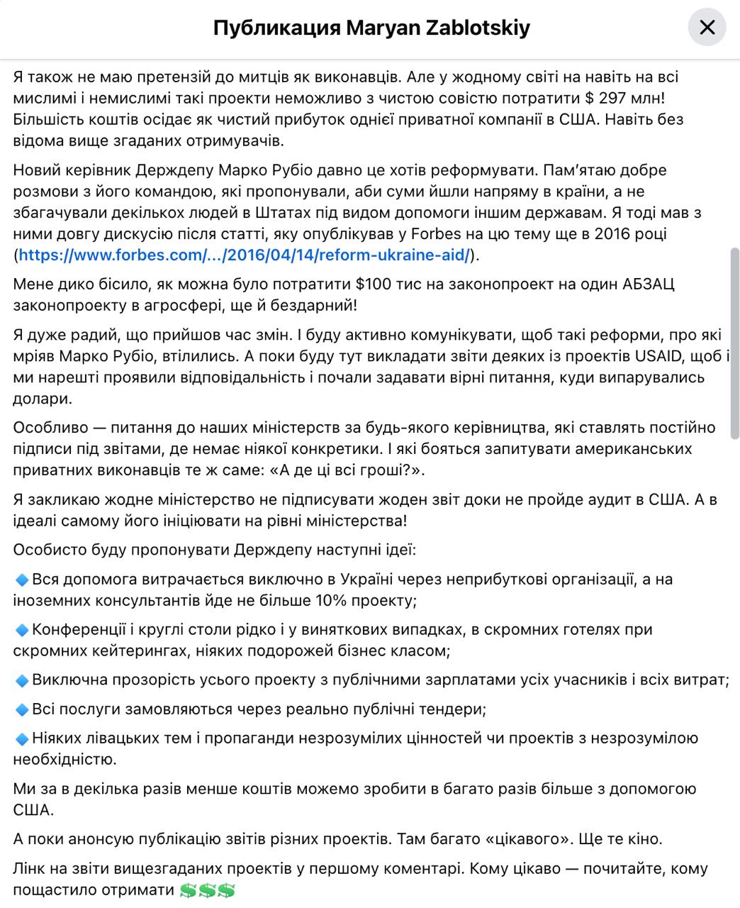 "И таких проектов – десятки. Возможно, оно кому-то нужно. Но зачем это американским налогоплательщикам, я не совсем понимаю. И почему нам не просить средства на что-то явно более необходимое?" - задался вопросом Заблоцкий.