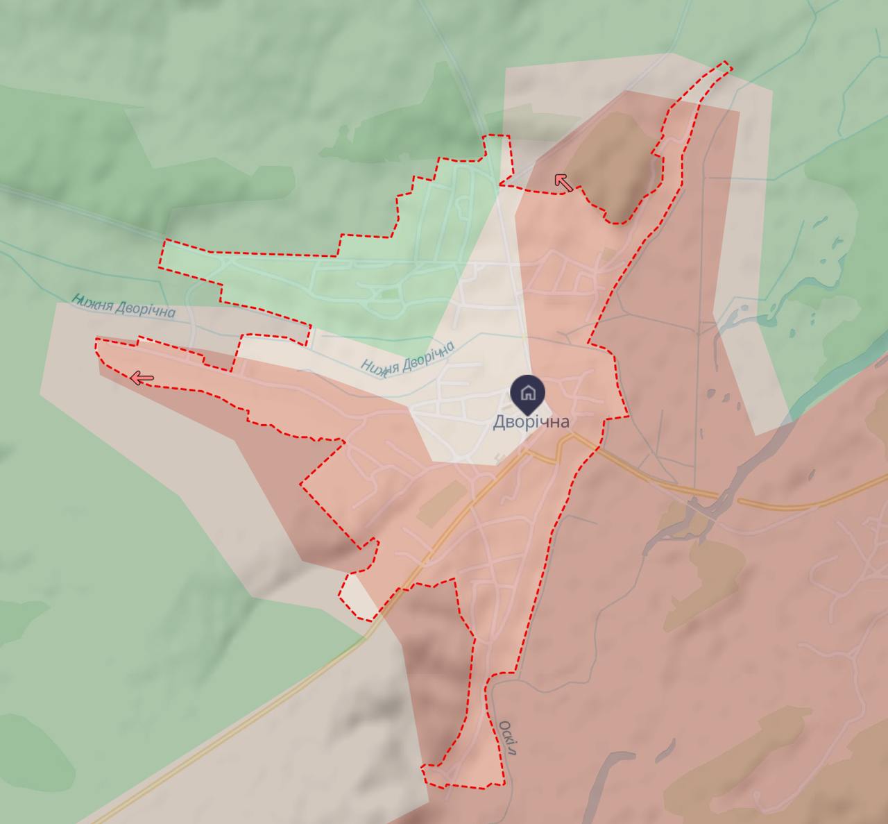 На карте Deep State указано присутствие ВСУ в северо-западном районе поселка и серая зона в его центре. Остальное занято российской армией.